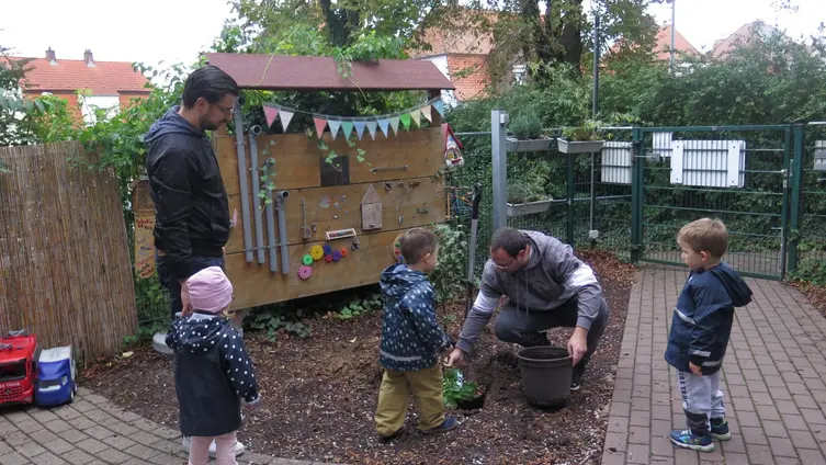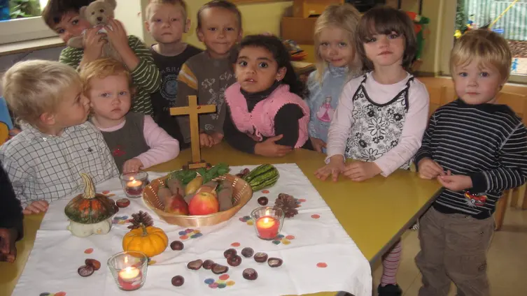 Wir erleben mit unseren Kindern das Kirchenjahr, planen und gestalten mit ihnen Gottesdienste, die von unserem Pfarrer theologisch begleitet werden. Er kommt regelmäßig in unsere Einrichtung, um mit den Kindern zu singen, zu beten und biblische und andere Geschichten zu erzählen. Den Kindern wird somit die Möglichkeit angeboten, ein vertrautes Verhältnis zu christlichen Werten zu finden.